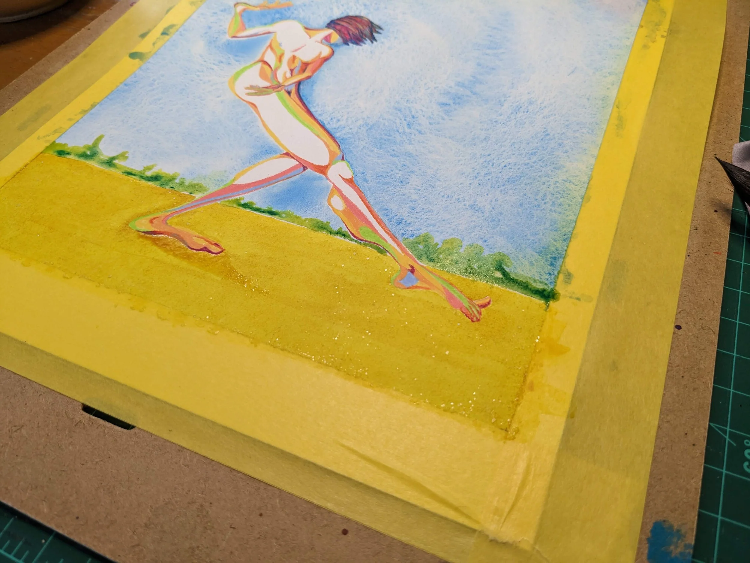 Look closely in this artwork and you will notice glinting crystals in the yellow section of ground. These are salt flecks and I used them to create a unique texture and play with the opacity of the watercolor pigments there. The figure was so juicy, I wanted to put him somewhere warm and dry.