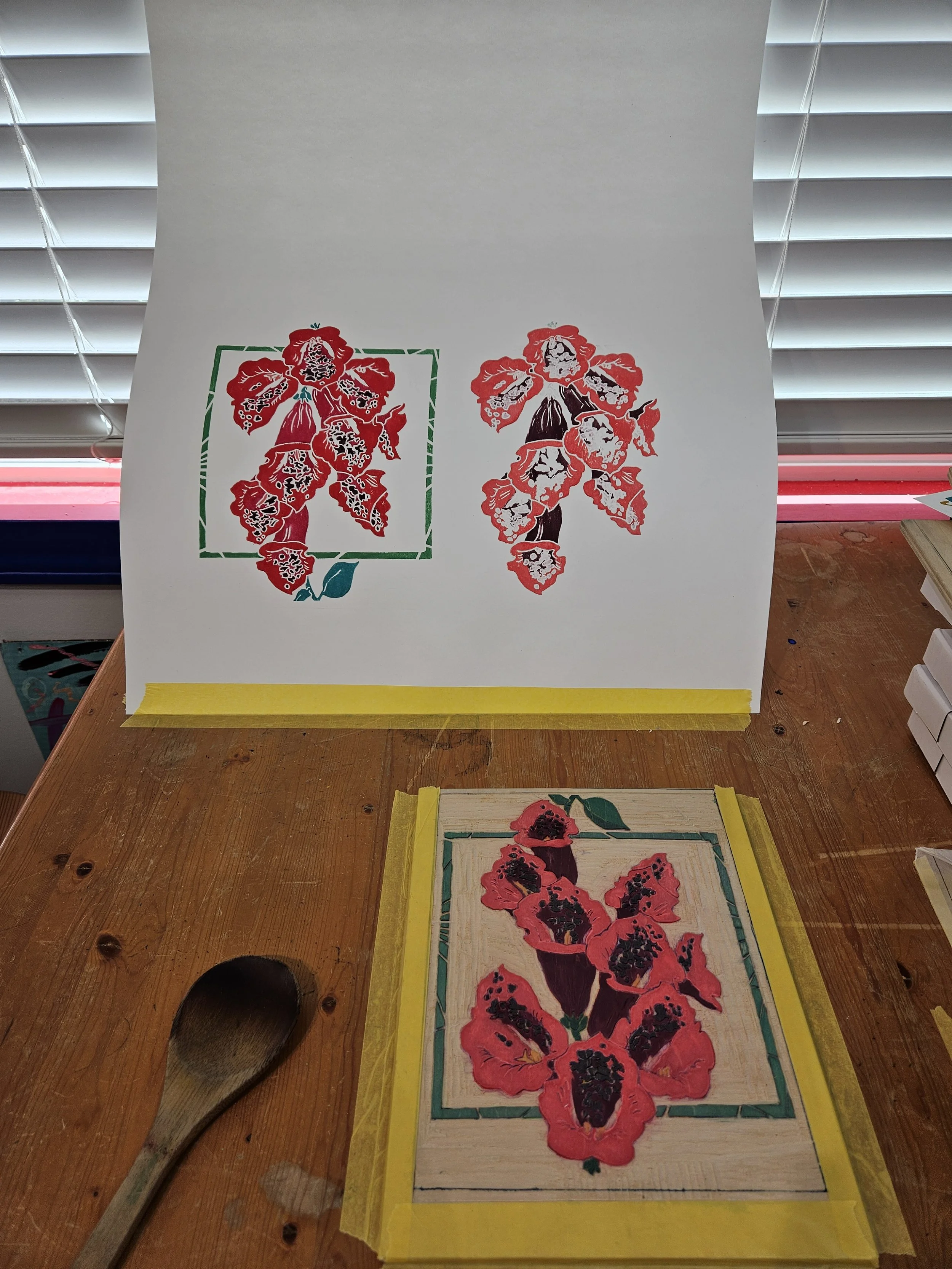 Foxgloves usually come in pale shades of lavender or blush. But that’s not really my style. My favorite color palette is face-punching-rainbow, so I had to make another Field of Foxgloves in these splashy hues. They really help tip the composition toward the hi-viz pop-art look I was imagining when I realized I could paint/print multiples of these white line woodblock works. They make me smile - big. I hope they make you smile, too!
